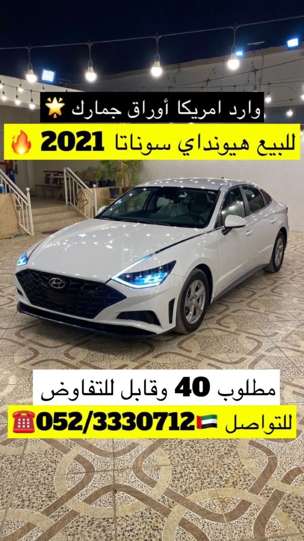 Hyundai and Sonata imported from America, model 2021 هيونداي سوناتا موديل 2021 أبيض من الداخل رصاصي ماشية 66000ميل اوراق جمارك (غير مستخدم في الدولة) مفحوصة وناجحة ✅ مواصفات: فل أوتوماتيك .. كراسي كهربائية .. رنقات .. ليتات LED … قير الكتروني ..هاند اوتوماتيك .. تحديد مسار ..تحكم كامل فالسكان .. مثبت سرعة .. كيمرا خلفية ..بلوتوث …بطارية جديدة 🆕 سيارة اقتصادية ♻️ مكان المعاينة : عجمان السعر 40,000 وقابل للتواصل : 0523330712