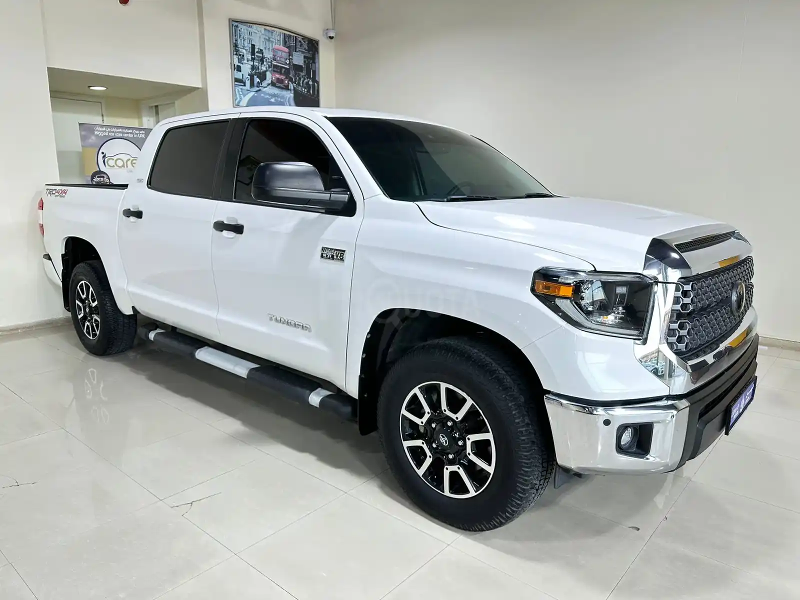 WhiteBlack Leather Toyota Tundra TRD with keyless start, four doors, and imported from Canada 🇨🇦. No paint or accidents, fully inspected, 2020 model with 50,000 km. Asking for 169,000 AED, negotiable. Financing available through the bank. Located in Al Shamkha, Abu Dhabi. Contact Al Bayan Motors for details.